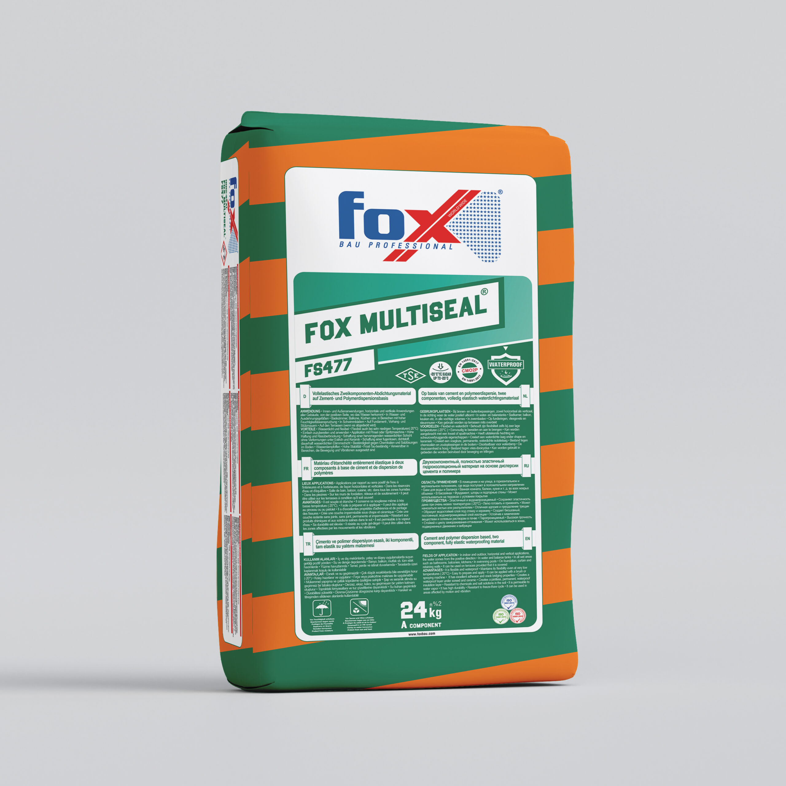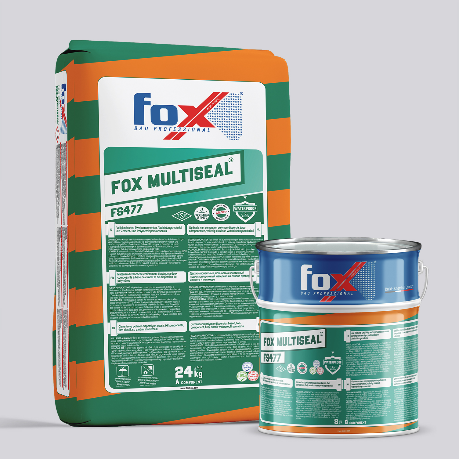FOX MULTISEAL® FS477, Çimento ve Polimer dispersiyon esaslı, iki komponentli, çok düşük sıcaklıkta (-20°C) çatlak köprüleme özelliğine sahip, klorlu suya karşı dirençli, her türlü betonarme yüzey ve çimento esaslı sıvalar için dizayn edilmiş tam elastik su yalıtım malzemesidir.